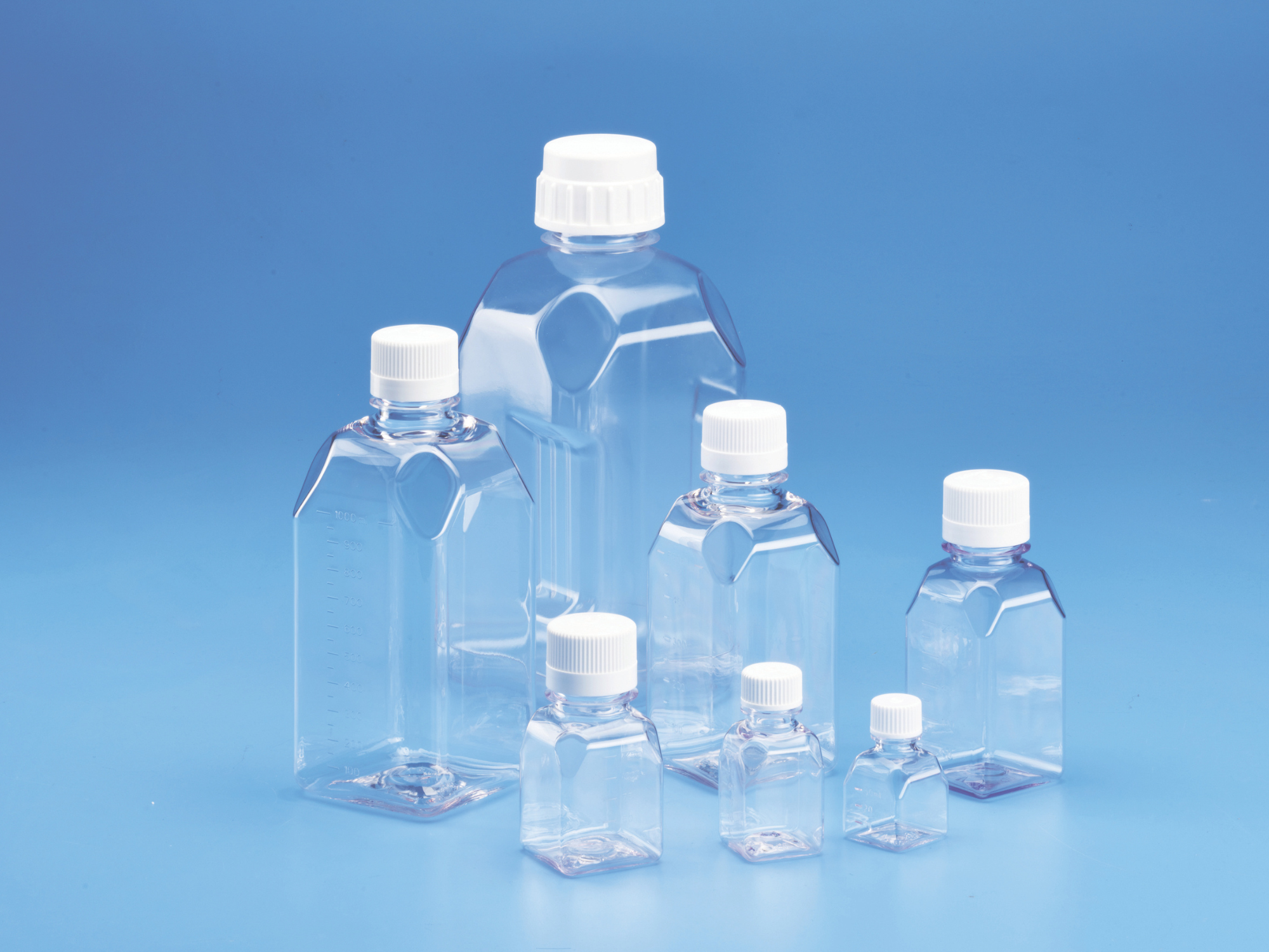 Description: Sterile Square Graduated Media Bottles, PETG with white HDPE Closure, Natural