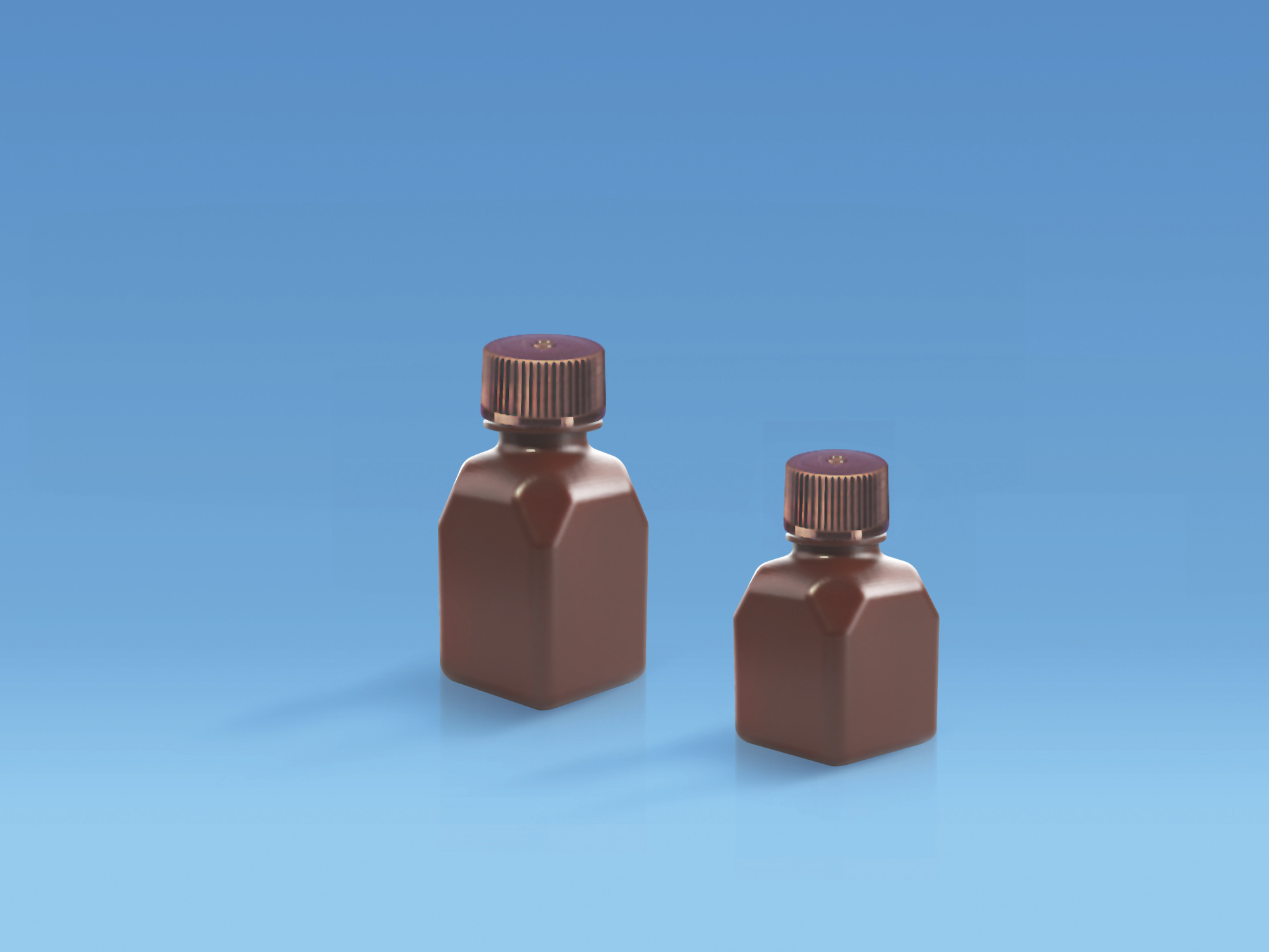 These square, graduated, clear Bottles are made from USP Class VI-compliant, non-pyrogenic and non-cytotoxic Polyethylene Terephthalate Glycol (PETG) with a High-Density Polyethylene (HDPE) closure. Leakproof, Free of detectable pyrogens, RNase & DNase, non-cytotoxic. Amber Bottles meet USP light-resistant requirements. PETG bottles are gamma-sterile, packed in shrink-wrapped trays or individually packed having a heat-shrink band around the closure and neck that provides a tamper-evident seal.